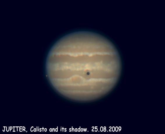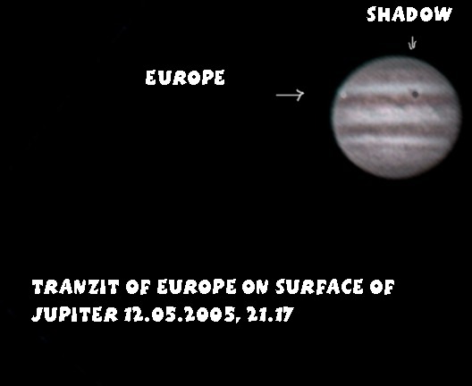Prehod Jupitrove lune Evropa preko Jupitra 12.05.2005 ob 21.17 uri. Meade lx200, Philips toucam. 300 framov stakiranih v Registax 3 programu.