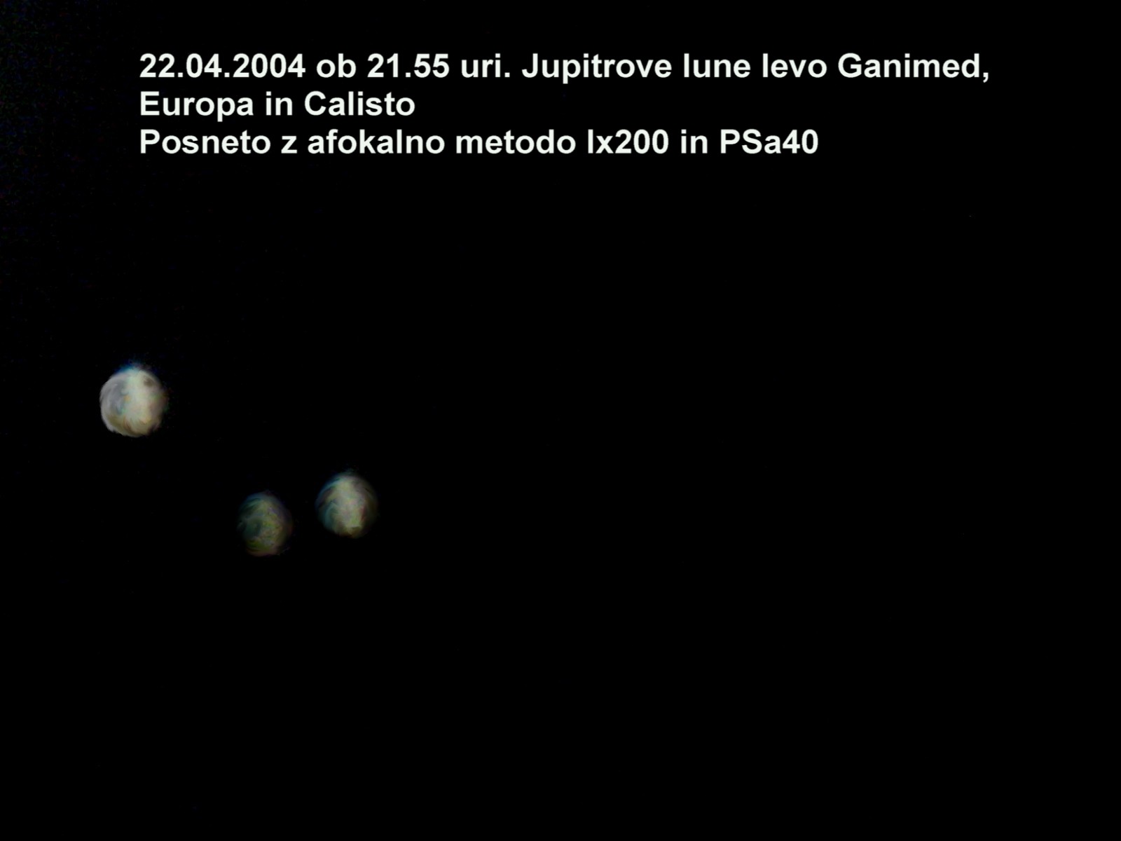 Planet Jupiter posnet 28.03.2004 ob 21.15 uri z afokalno metodo Meade lx 200, digitalni fotoaparat Canon PSa40.