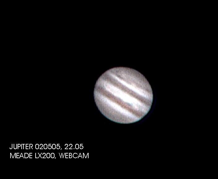 Planet Jupiter posnet 02.05.2005 ob 22.00 uri z Meade LX200 in Philips Toucam. 300 framov stakiranih skupaj v Registax 3.